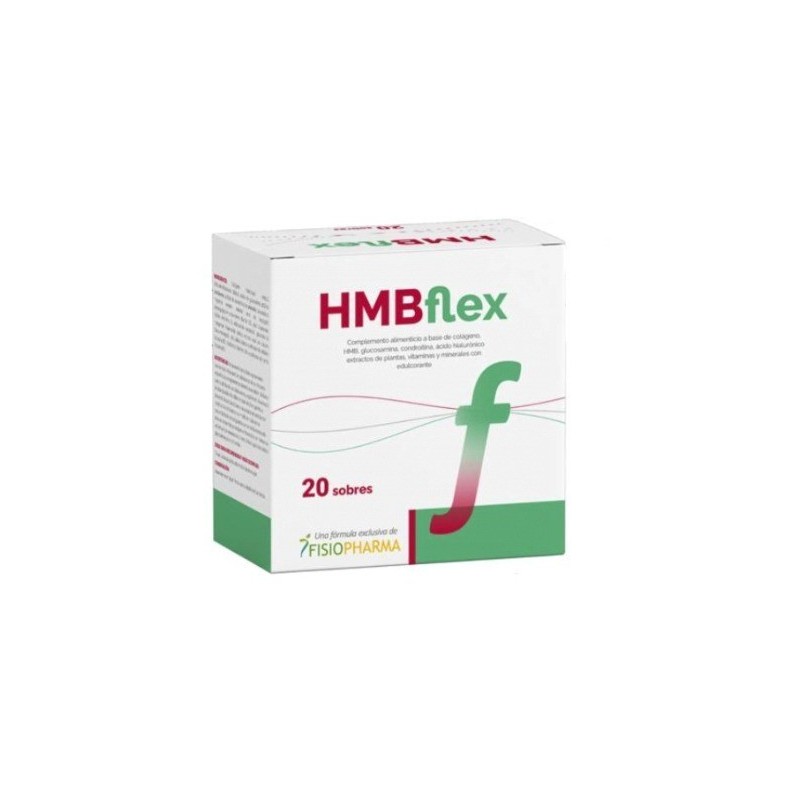 HMB Flex 20 Sobres. Complemento alimenticio a base de colágeno, HMB, glucosamina, condroitina, ácido hialurónico, extractos de plantas, vitaminas y minerales con edulcorante.